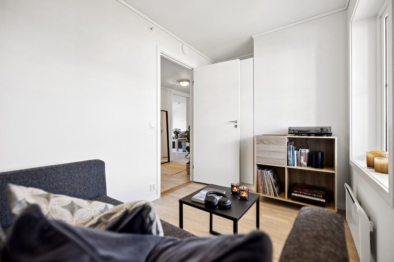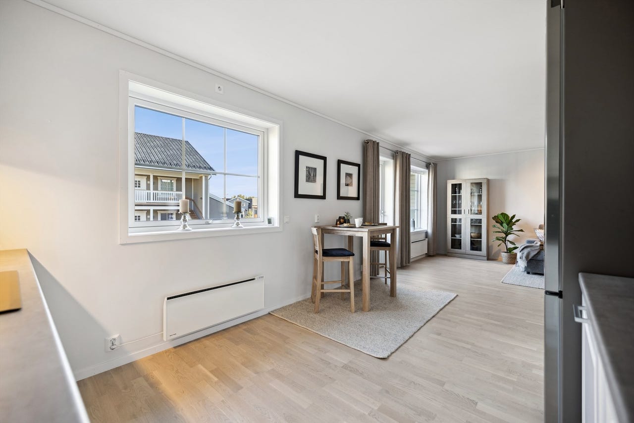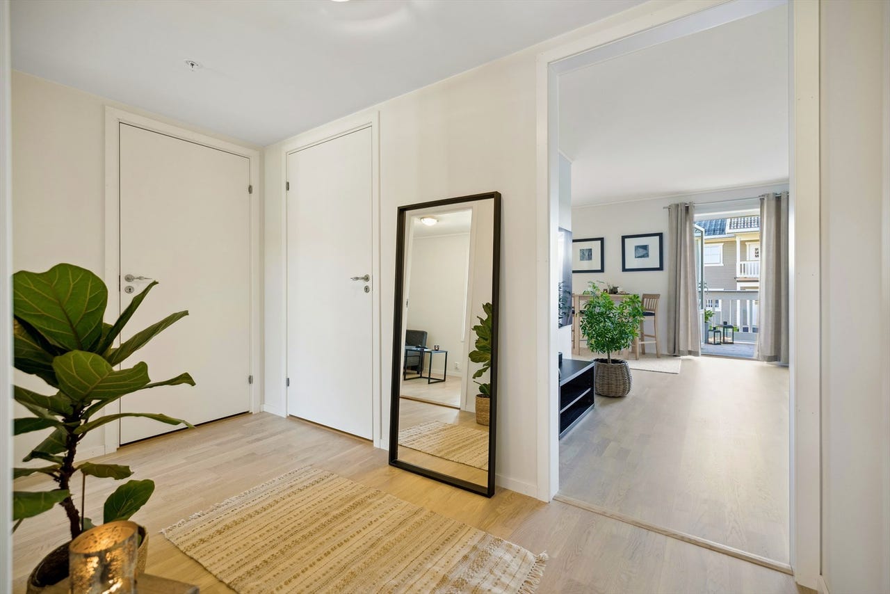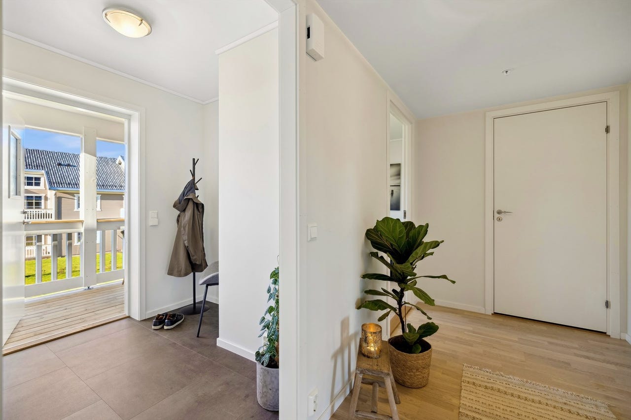 Fra svalgangen ønskes du velkommen inn i en romslig entré med deilig varme i gulv med klikkvinyl, som er lett å holde ren. Her er god plass til oppheng for ytterklær og oppbevaring av sko. Entréen er i åpen løsning til gangen, som har tilkomst til alle rommene i leiligheten. Gangen har parkett på gulv, malte slette vegger i fargen Refleksjon og hvitmalt slett himling.
