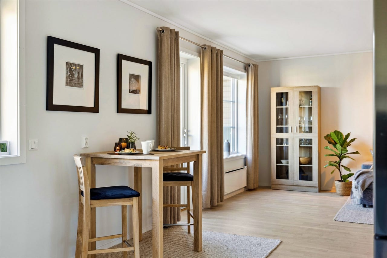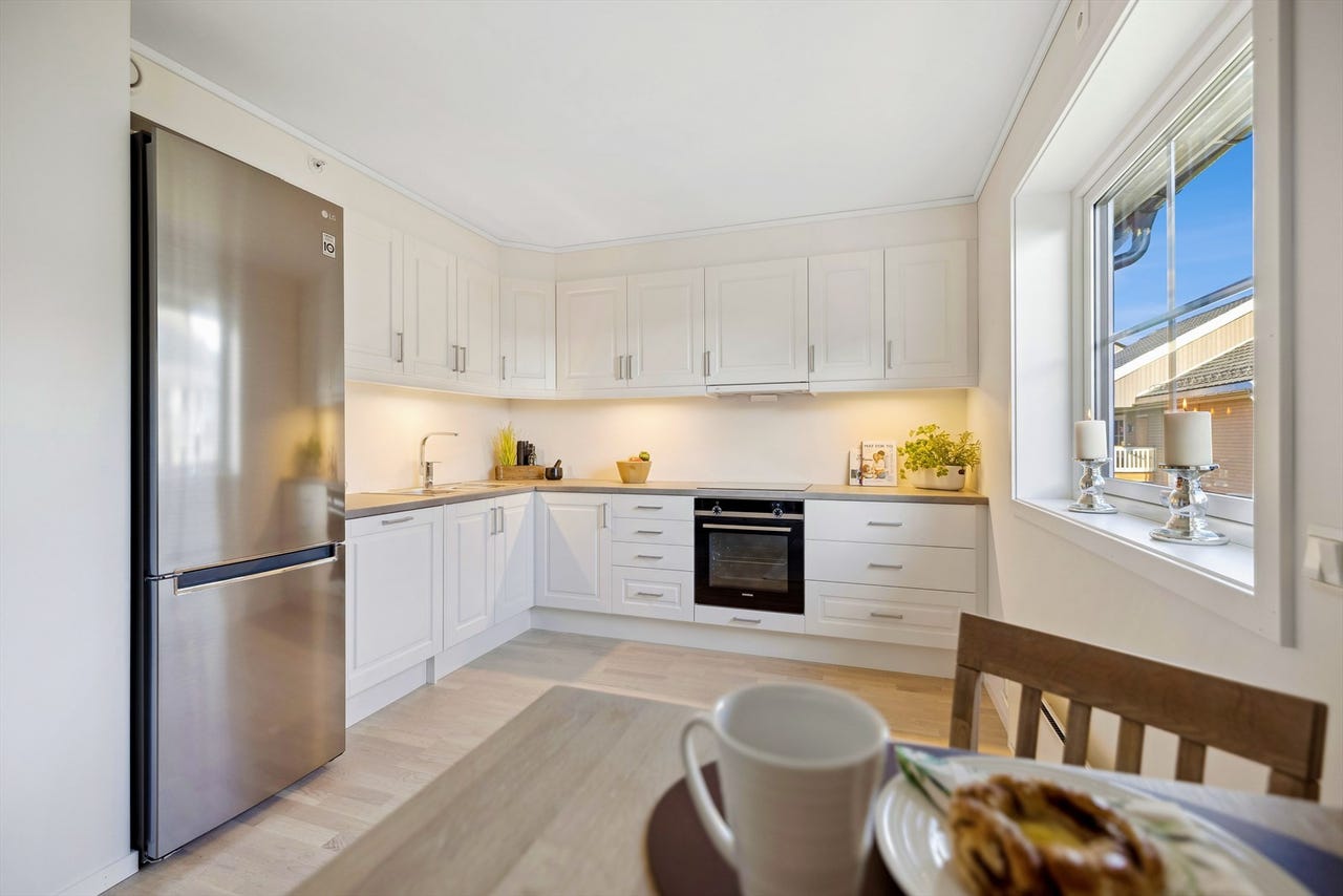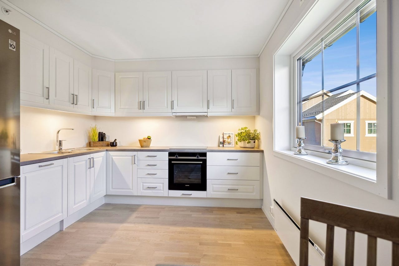 Romslig og moderne kjøkken i åpen løsning til spiseplassen og stuen, med integrerte hvitevarer i fra Siemens og frittstående kombiskap fra LG. Kjøkkeninnredningen har over- og underskap med profilerte fronter, skapdører, skuffer med demping og laminerte skrog. Laminert benkeplate med nedsenket oppvaskkum i kompositt og ett-greps armatur. Veggoverflater over kjøkkenbenk med malte plater og det er montert belysning under overskapene. Integrerte hvitevarer består av platetopp, stekeovn, oppvaskmaskin og ventilator. LG kombiskap, kjøl/frys er plassert i kjøkken nisje og det er godt med strømuttak til ekstra kjøkkenutstyr. Det er parkett på gulv, malte slette vegger i fargen Refleksjon og hvitmalt slett himling med downlights. Komfyrvakt er montert, lekkasjevakt er ikke montert.