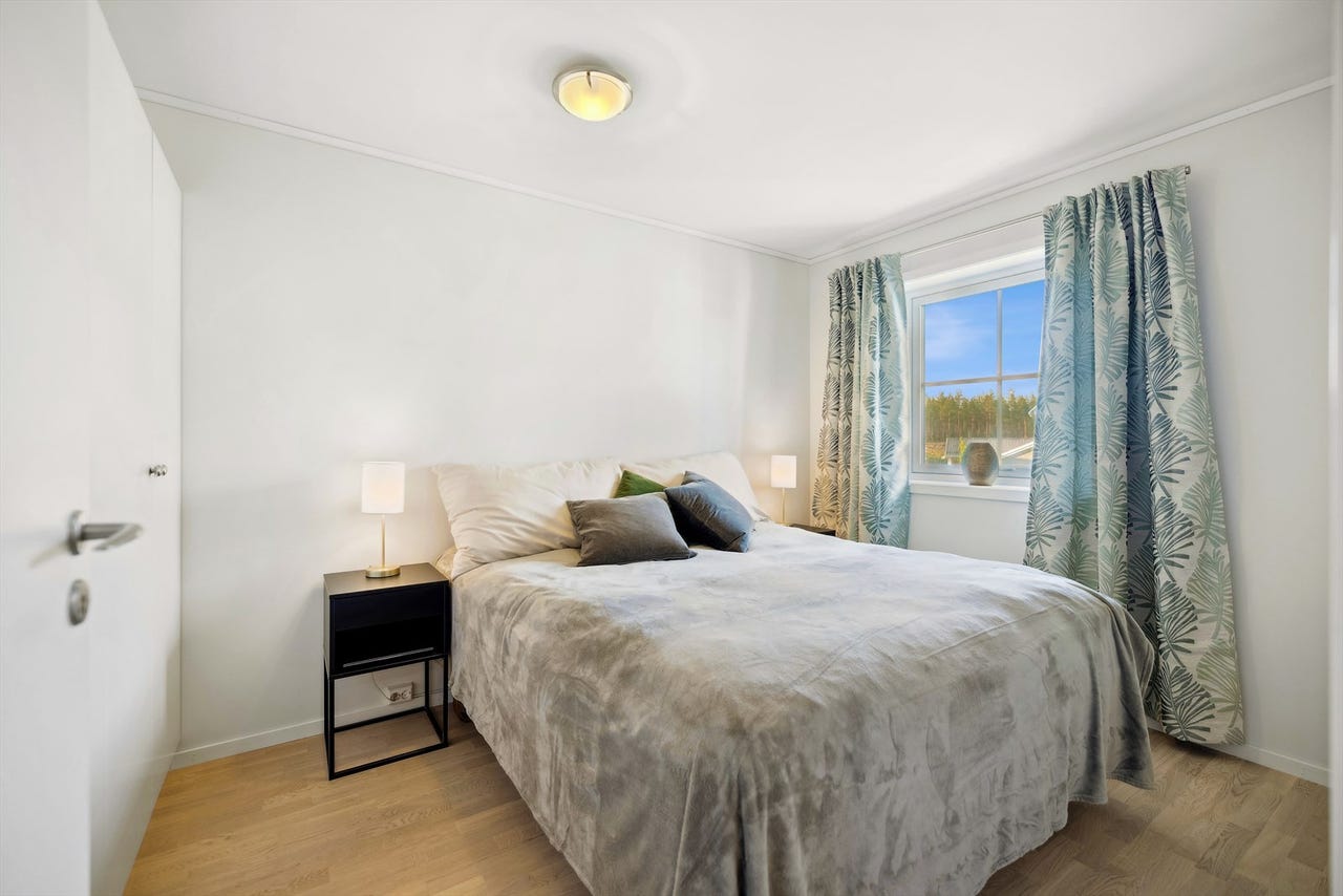 Hovedsoverommet er lyst og luftig og er beliggende på høyre hånd med adkomst fra gangen, rett innenfor entréen. Soverommet har vindu mot nord og et fint utsyn mot felles parkanlegg/grøntarealer og lekeplass. Rommets retning mot nord, gjør at det er svalt om sommeren og lunt om vinteren. Her er det god plass til dobbeltseng og det er montert et romslig dobbelt garderobeskap med forskjellig innredning innvendig. Det er parkett på gulv, malte slette vegger i fargen Refleksjon og hvitmalt slett himling.