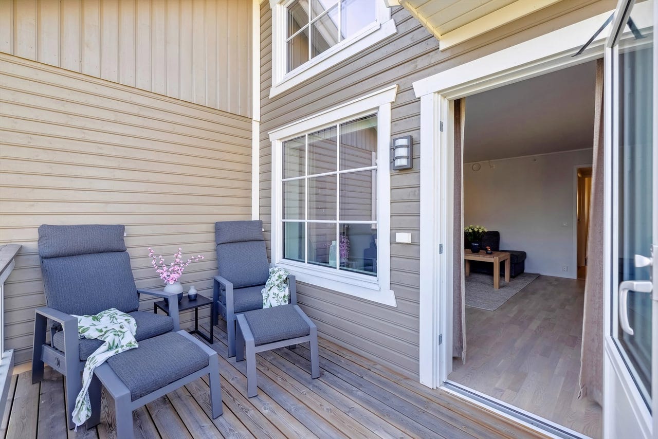 Sørvendt, lun og solrik terrasse med adkomst fra stuen er adskilt med husvegg mot vest og har et fint utsyn mot sør og øst. Terrassen er fundamentert med tresøyler plassert på støpte pilarpunkter, gulv med impregnerte terrassebord, malt spilerekkverk med håndløper. Terrassen har opplegg for strøm med utelampe og stikkontakt med 2-uttak.