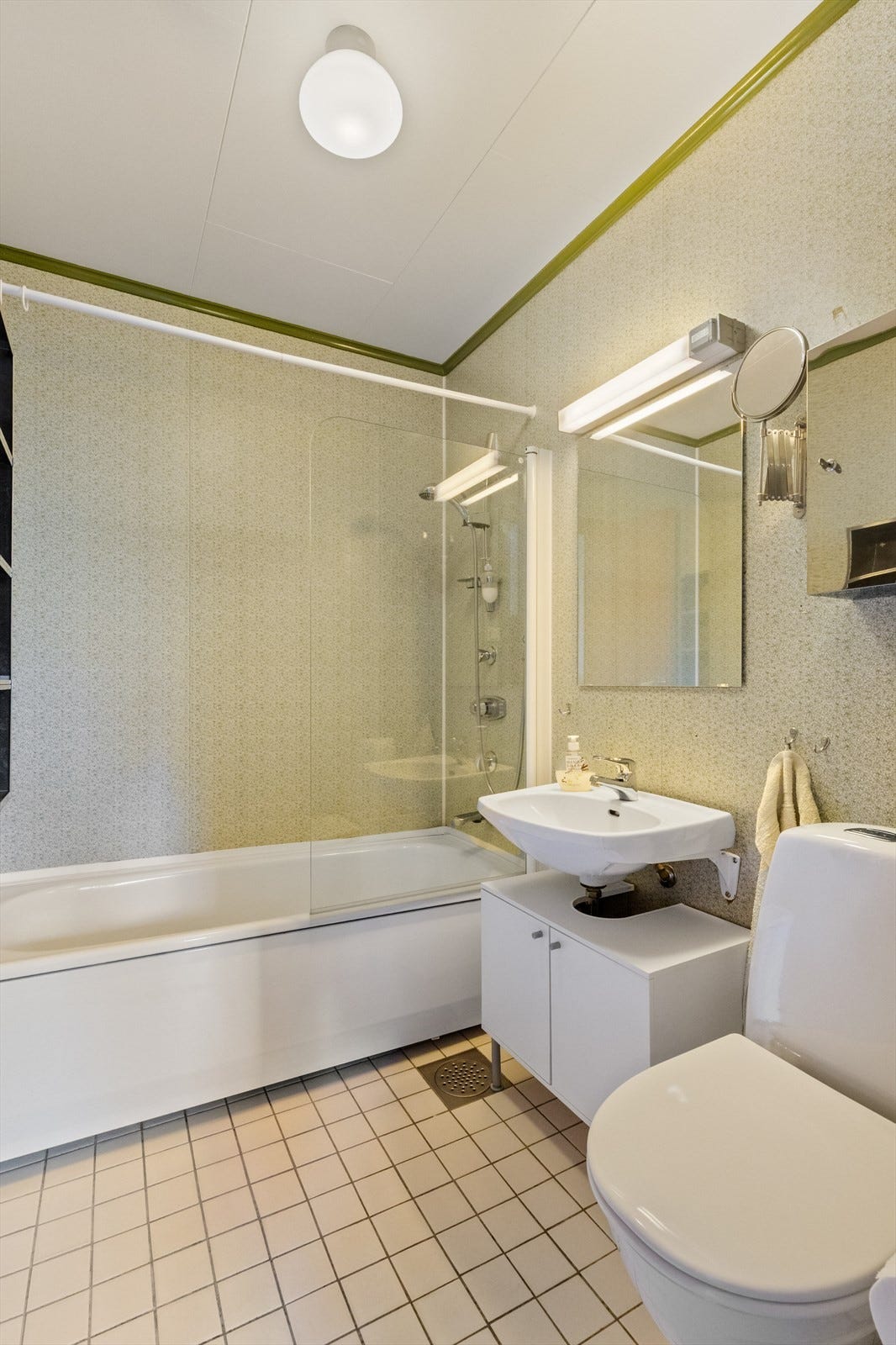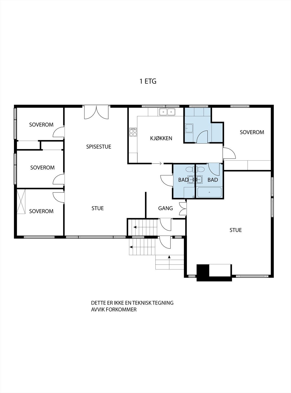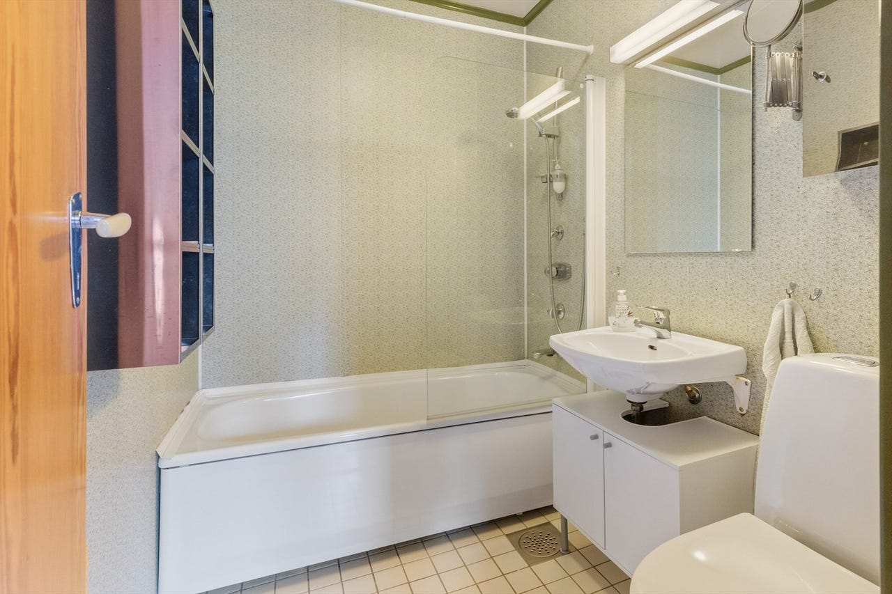 * Våtrom > Bad 2: Baderom fra opprinnelig byggeår. Grunnet elde og påviste forhold (se tilstandsrapport), må baderommet renoveres. Slukmansjett ikke påvist, ukjent vedrørende membransystem, gulv med mangelfullt fallforhold. For å få tilstandsgrad 0 eller 1 må gulvet bygges om for å oppnå riktig fall/høyde til sluk. Ved fremtidig renovering må det påse at baderommet blir etablert med riktig fall etter gjeldene forskriftskrav. Ingen tegn til fuktproblematikk ved baderommet eller tilstøtende bygningsmasse som kan settes i sammenheng med rommets funksjoner.