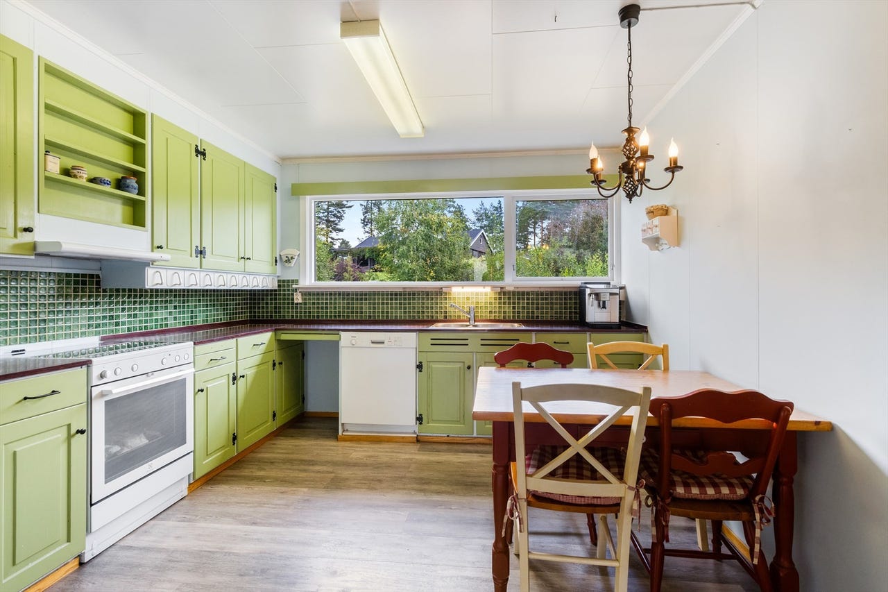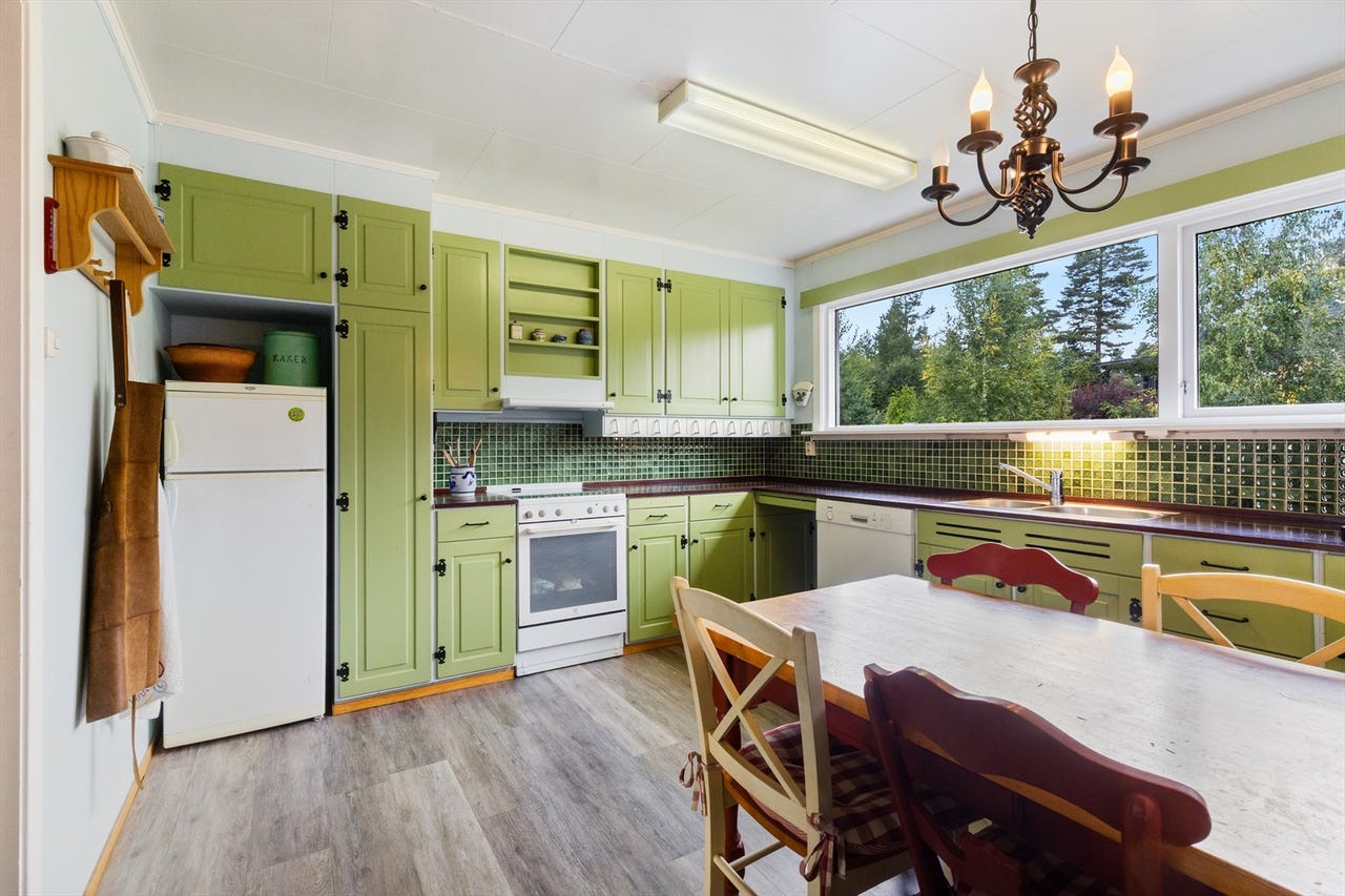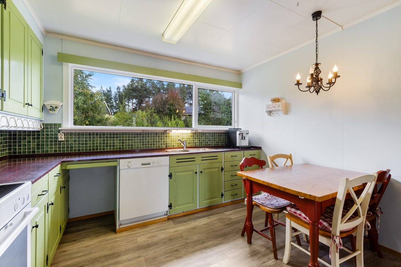 Rustikt og romslig kjøkken med spiseplass fra opprinnelig byggeår med adkomst fra gang/entré og mellomgang. Kjøkkenet er lyst og trivelig med store vinduer i nordøstlig retning med utsyn mot hage og nabobebyggelse. Kjøkkeninnredning med malte profilerte fronter og laminerte skrog, laminert benkeplate med nedsenket oppvaskkum og utslagsvask i metall. Veggflater over benkeplater med fliser, overgang med trelist. Kjøkkenet har opplegg for oppvaskmaskin og hvitevarer er montert i kjøkken nisjer. Ventilator over koketopp med avkast ført over tak direkte til friluft. Lekkasjevakt og komfyrvakt er ikke montert. Kjøkken har over- og underskap med normal bruksslitasje, enkelte fronter med noe justeringsbehov. Ingen påviste tegn til fuktrelaterte følgeskader som kan settes i sammenheng med rommets funksjoner. Kombiskap med kjøl/frys og oppvaskmaskin medfølger i salget. Opprinnelig komfyr fra bilder i annonsen følger ikke med handelen, men en solid Beha hvit komfyr med emaljert koketopp med støpejernsplater, meget pent brukt, som kan følge med etter nærmere avtale selger.