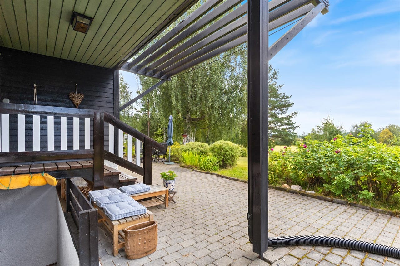 Herlig og trivelig uteplass/pergola mot øst med adkomst fra terreng. Gulv med belegningsstein. 2 yttervegger i bindingsverk med utvendig liggende kledningsbord, øvrig er åpent. Tak med sperrekonstruksjon tekket med transparente plater. Renner og nedløp er ikke montert. Ildsted med åpen peis i murt omramming. Målt gulvarael på 12 m2.