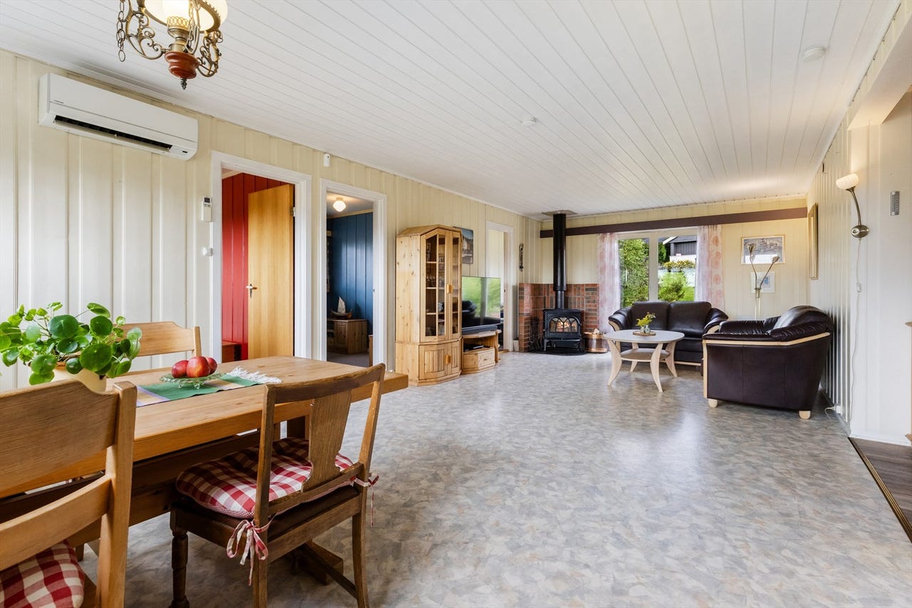 Lys og romslig stue med spisestue og en herlig peisestue.