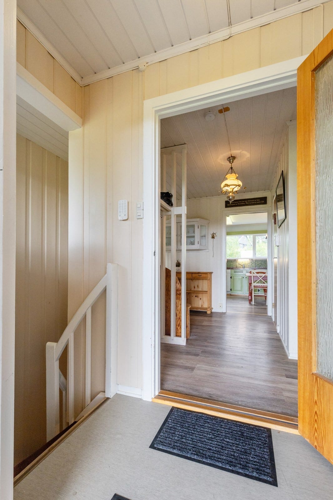 Vegger med behandlet panel, tapet og malte plater.
