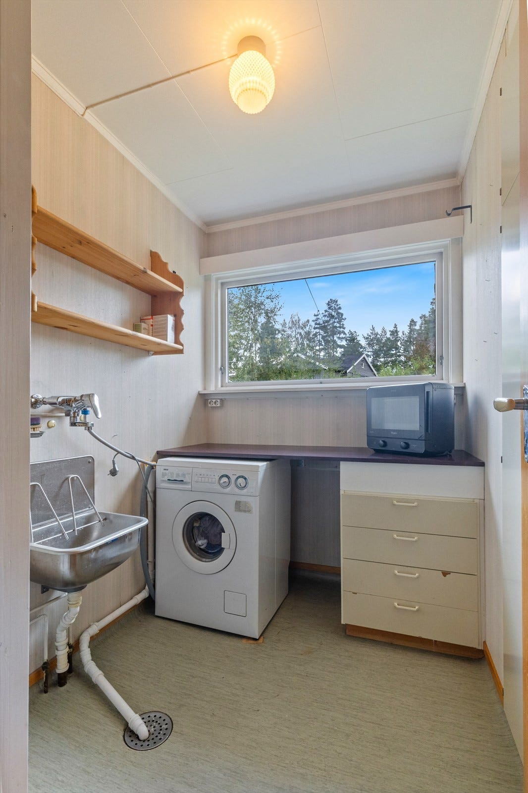 Praktisk vaskerom med adkomst fra mellomgang, har installasjoner med opplegg for vaskemaskin under benkeplate med skuffeseksjon, vindu over arbeidsbenk og en utslagsvask i metall, montert på vegg. Det er belegg på gulv, vegger med beleggsoppbrett og tapet. Takess plater i himling og ventilasjon med naturlig avtrekk via himlingsventil, tilluft via åpen dør.