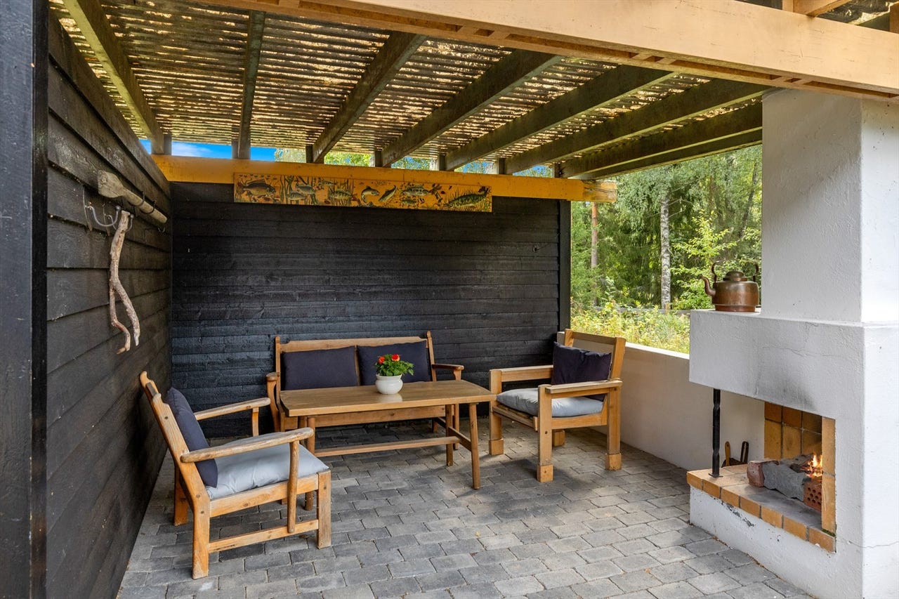 Overbygd uteplass med utepeis ideelt for sosiale kvelder