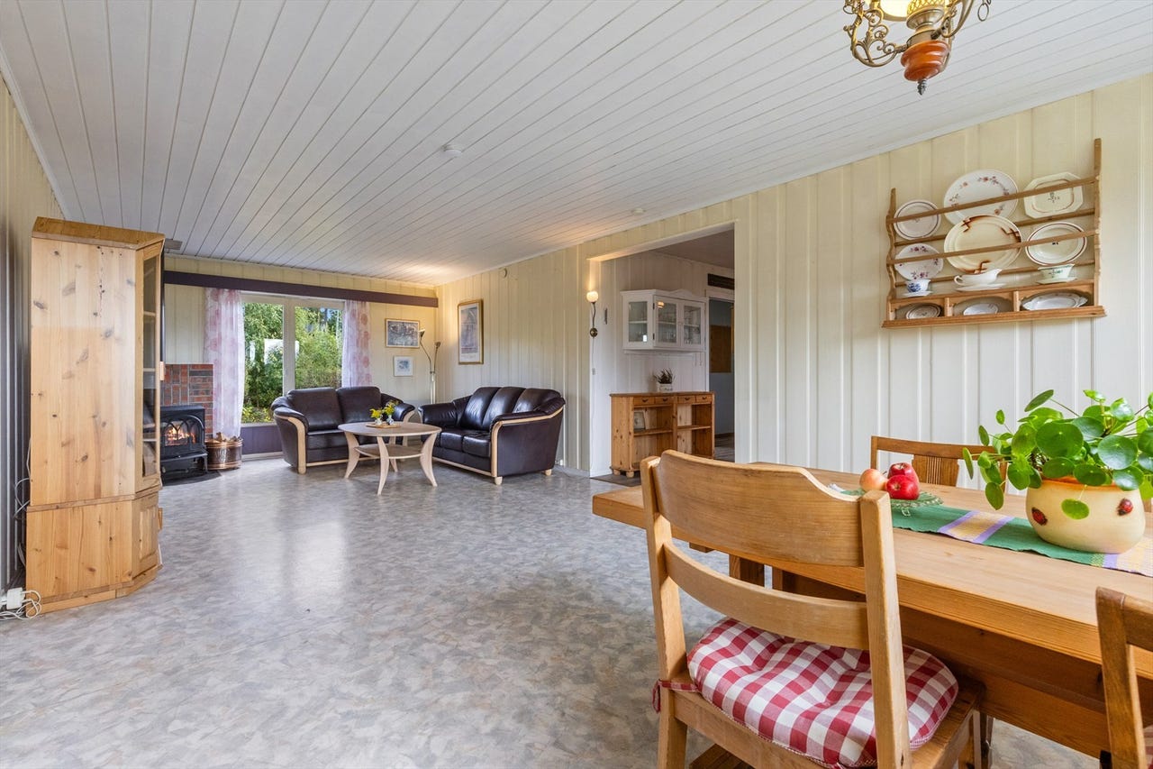 Stuen er lys, romslig og trivelig i en rektangulær utforming med peisovn plassert i hjørnet av rommet og har en egen utgang til hagen. Stuen er i en åpen løsning til spisestuen og har tilkomst til 3 soverom. Spisestuen er sørøstvendt med et fint utsyn til hagen og nærliggende åker og eng. Her er det en luft-til-luft varmepumpe montert oppe på vegg og det er god plass til spisemøblement. Det er belegg på gulv, malt panel på vegg og i himling.