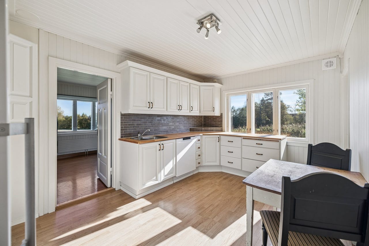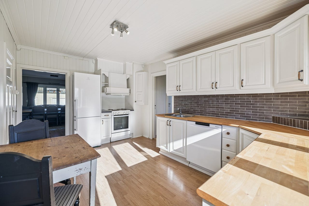 Kjøkkeninnredning av eldre og ukjent dato. Innredning med malte profilerte fronter og heltre skrog. Heltre benkeplate med nedsenket oppvaskkum i metall. Veggflater over benkeplater med fliser, overgang med mykfug. Kjøkken med opplegg for oppvaskmaskin, hvitevarer plassert i kjøkken nisjer. Komfyrvakt og lekkasjevakt er ikke montert.