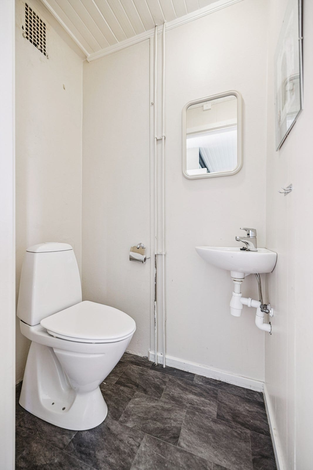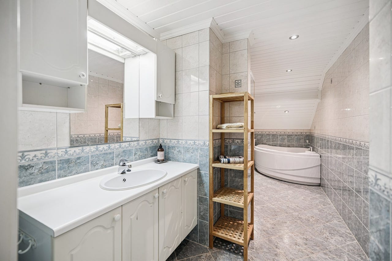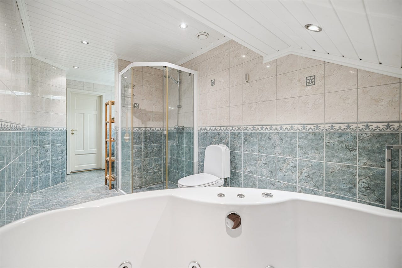 Gulv og vegger med fliser, deler av baderom med innvendige skråhimlinger. Oppvarming med elektrisk gulvvarme. Installasjoner med gulvmontert WC, servant i innredning, dusjhjørne og badekar.