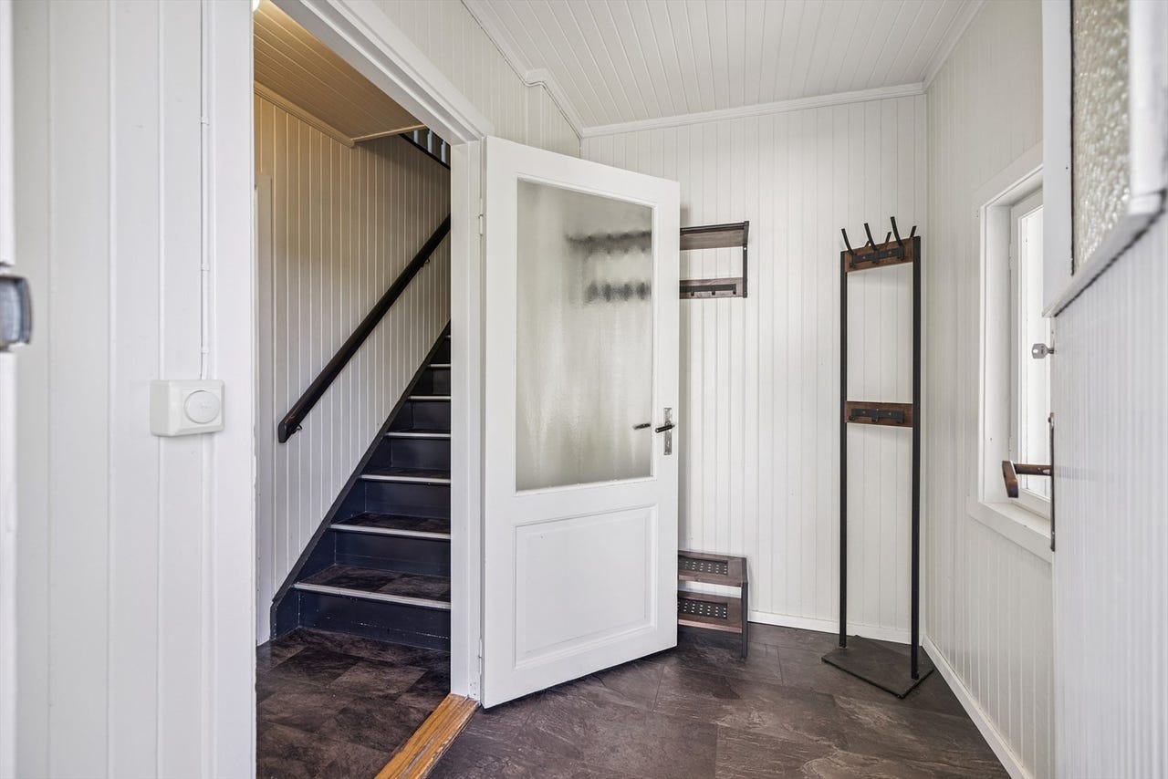 Kjellertrapp, det er ikke etablert rekkverk i trappen. Kjellertrapp mot betonggulv med fare for fuktopptrekk i trappevanger, utbedringer med fuktsperre mot betonggulvet må etableres. Åpninger ved opptrinn og rekkverk på over 10 cm, dette utgjør en risiko for små barn og dyr. Lav ganglinje i kjellertrapp, (krav min 2,1 m). Kjellertrapp mot betonggulv med fuktopptrekk i trappevanger, utbedringer med fuktsperre mot betonggulvet må etableres. Målt fukt i treverk mot betonggulvet med fuktverdi på 29,6% som er over faregrensen for utvikling av sopp og råteskader.