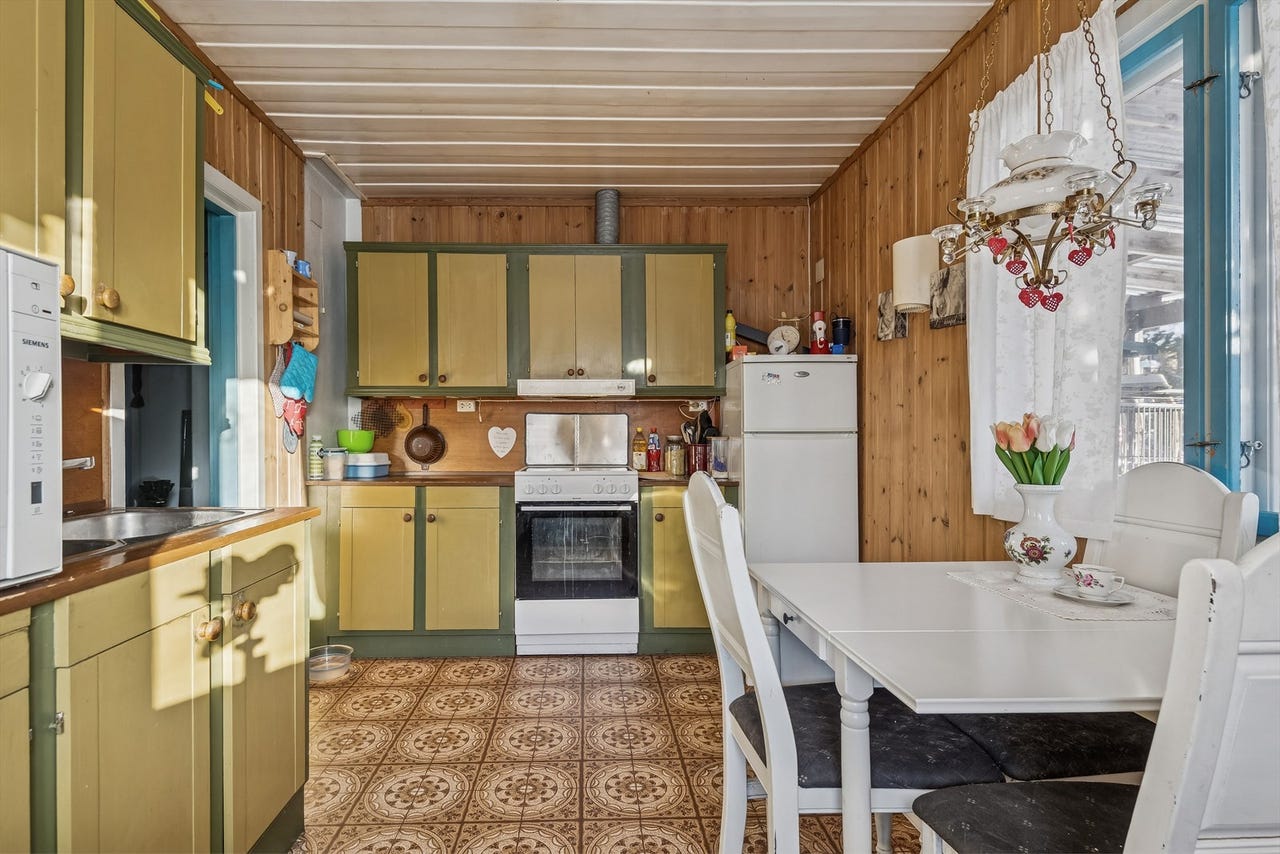 Heltre kjøkken fra opprinnelig byggeår. Heltre benkeplate med nedsenket oppvaskkum i metall, hvitevarer med kjøleskap og komfyr plassert i kjøkkennisjer. Veggflater over benkeplater med trefiberplate, overgang med trelist. Kjøkken med opplegg for frittstående benkeoppvaskmaskin (Opplyst defekt).