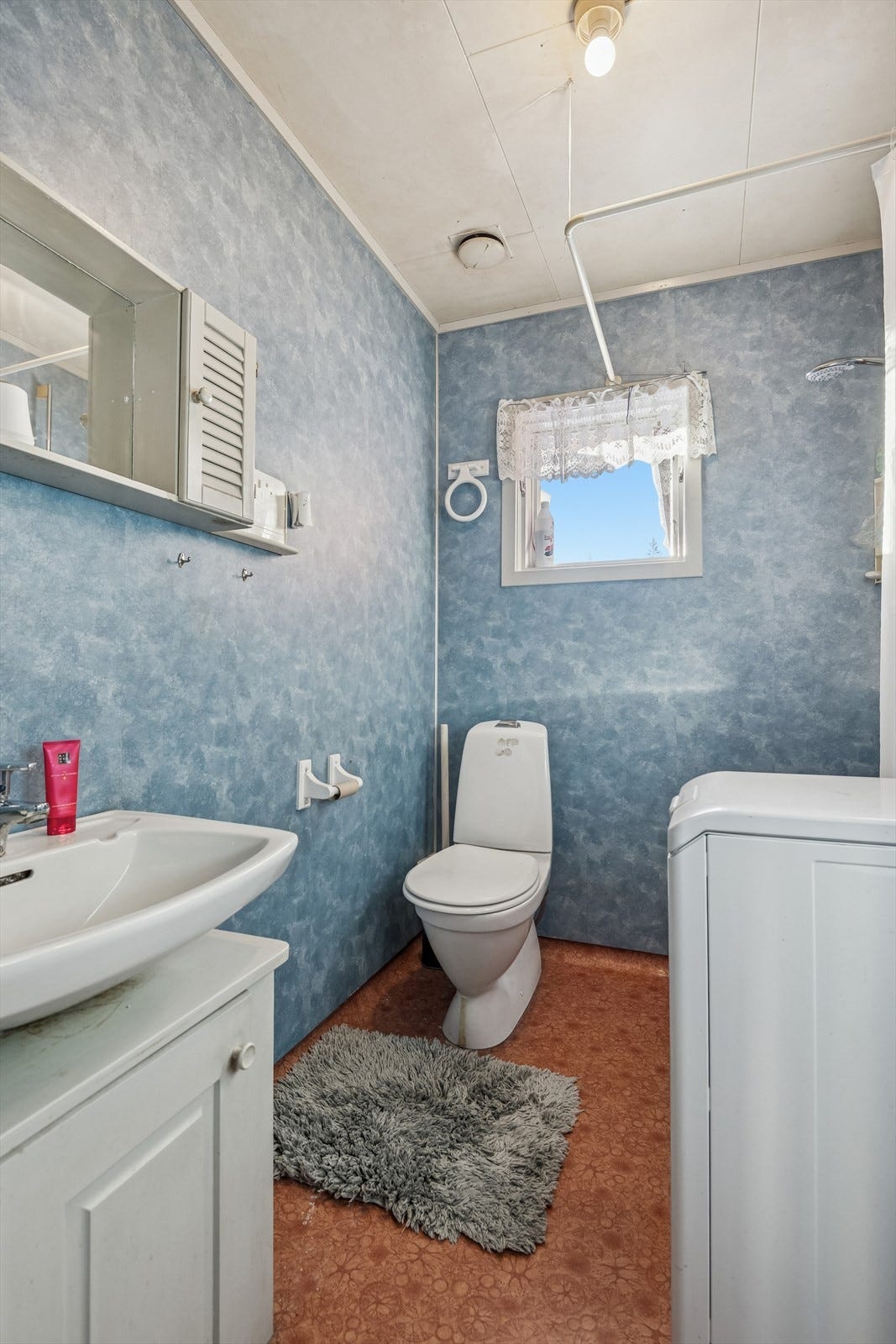 Våtrom bad 1.etg, baderommet har overskredet sin forventet levetid. Vindu er plassert i våtsone og utsettes for direkte vannsprut, ukjent vedrørende fukt- og råteskader i skjulte kontsrukjsoner. Karmlist og foringer på vindu er ikke fuktbestandig og vil kunne svelle, misfarges og brytes ned ved fuktbelastning. Gulv med svakt fallforhold til sluk, tilfredsstillende fuktsikring med oppbrett ved dør og evt lekkasjevann blir ivaretatt. Rørgjennomføring tilknyttet dusj med manglende oppbrett, forholdet vurderes som mangelfullt og kan medføre fuktskader i skjulte konstruksjoner. Det registreres noe oppsprekking av gulvbelegg inne på baderommet. Ved renovering må det påse at baderommet blir etablert med riktig fall etter gjeldene forskriftskrav. Det er foretatt hulltaking med 73 mm hullbor fra tilstøtende gang. Ingen tegn til fuktproblematikk ved baderommet eller tilstøtende bygningsmasse som kan settes i sammenheng med rommets funksjoner. Målingene som er gjort er å betrakte som stikkkprøver og sier bare noe om tilstanden i nærheten til området der målingen er utført. PVC sluk fra byggeår av baderommet, ingen tegn til lekkasje. I forbindelse med renovering må sluket skiftes. Med bakgrunn av påviste forhold og alder må baderommet påregnes og totalrenoveres.