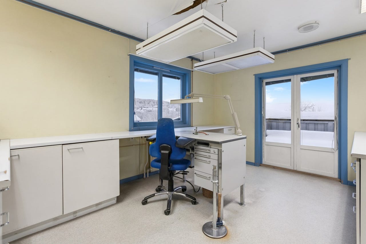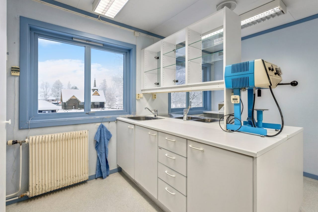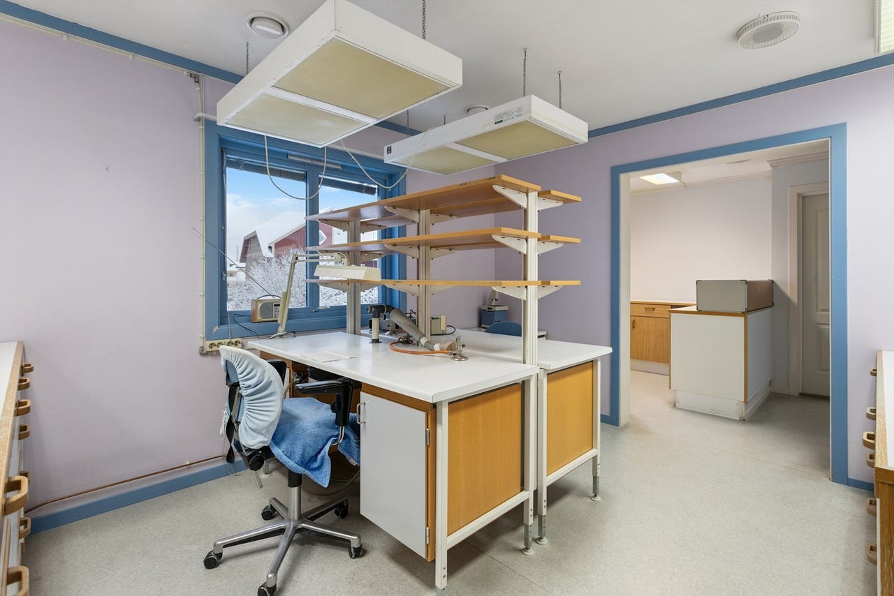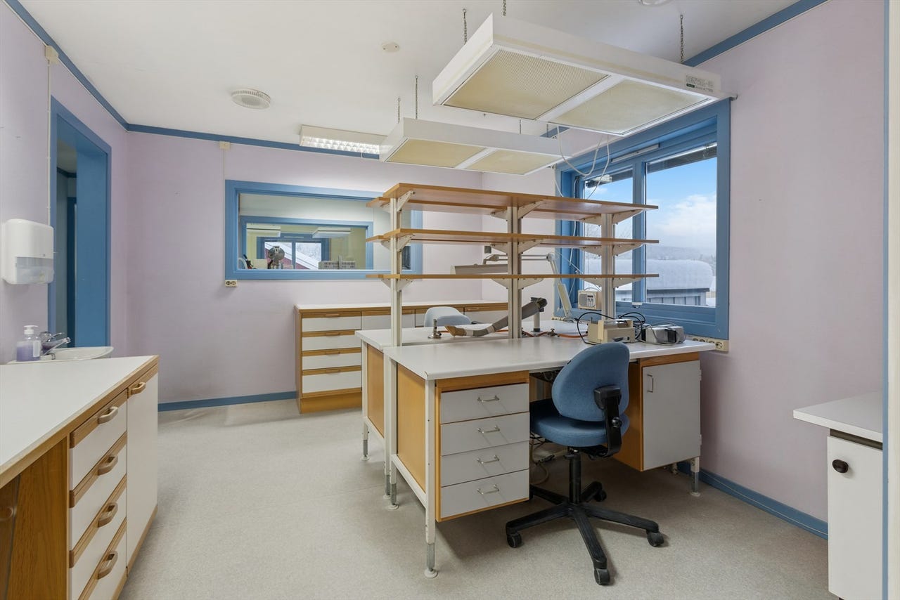 Her har vi gleden av å presentere næringsbygg med kjeller, 1.etg og 2.etg. Kjeller består av fellesarealer med trapperom/gang, fyrrom, garderober dusjrom, toalettrom, diverse boder og en blokkert kjellerutgang. 1.etg med felles trapperom og felles spiserom, og 2.etg med trapperom, venterom/resepsjon, adm. kontor (peisestue), toalettrom, 6 arbeidsrom/laboratorierom og ett kott.