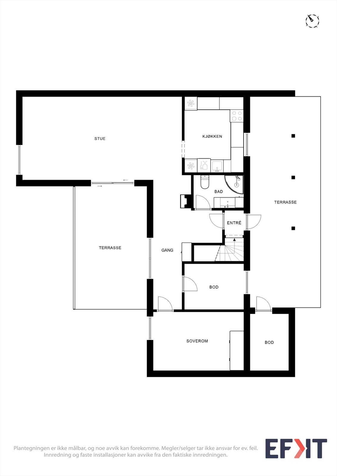 Selveierleilighet (eierseksjon og sameie) med 1.etasje og kjeller. Krypkjellere under deler av boligen med adkomst via luke i grunnmur i kjeller. Byggeår 1964 senere oppgradert og modernisert i perioden 2010-2013, med blant annet nytt kjøkken fra 2011 og nytt baderom fra 2013. Innvendige overflater av blandet alder. Opplyst om jevnlig utvendig overflatebehandling, siste behandling fra 2014. Terrassekonstruksjoner og overbygget inngangsparti fra 2012. Boligoppvarming med strøm- og vedfyring. Baderom med elektrisk gulvvarme. Ildsted med vedovn i gang 1.etasje. Mekanisk avtrekk på kjøkken og baderom, forøvrig med naturlig ventilasjon. Kjeller har risikokonstruksjoner ved at flere vegger er utforet og at gulv er utført med diffusjonsbegrensende overflater. Utførelsen vurderes på generelt grunnlag som risikokonstruksjoner forbundet med rom under terreng. Denne kjelleren fremsto ved befaringen med liten fuktbelastning konstruksjon og alder tatt i betraktning, ingen tegn til sviktende drenering. Krypkjeller under deler av boligen, adkomst via utsparing i grunnmur i kjeller. Krypkjellere vurderes på generelt grunnlag som risikokonstruksjoner forbundet med rom under terreng. Ingen visuelle tegn til skader som kan settes i sammenheng med tradisjonell fuktproblematikk forbundet med krypkjellere. Overflater og installasjoner med normal bruksslitasje. Utvendige fasader med normal slitasjegrad, noe vedlikehold ved utvendig fasader kan påregnes grunnet elde og påviste forhold. Ingen vesentlige feil eller mangler ble påvist ved befaringen. Ukjent vedrørende branntiltak mot naboleilighet, ytterligere undersøkelser bør foretas. For utfyllende opplysninger og merknader vises til rapporten.