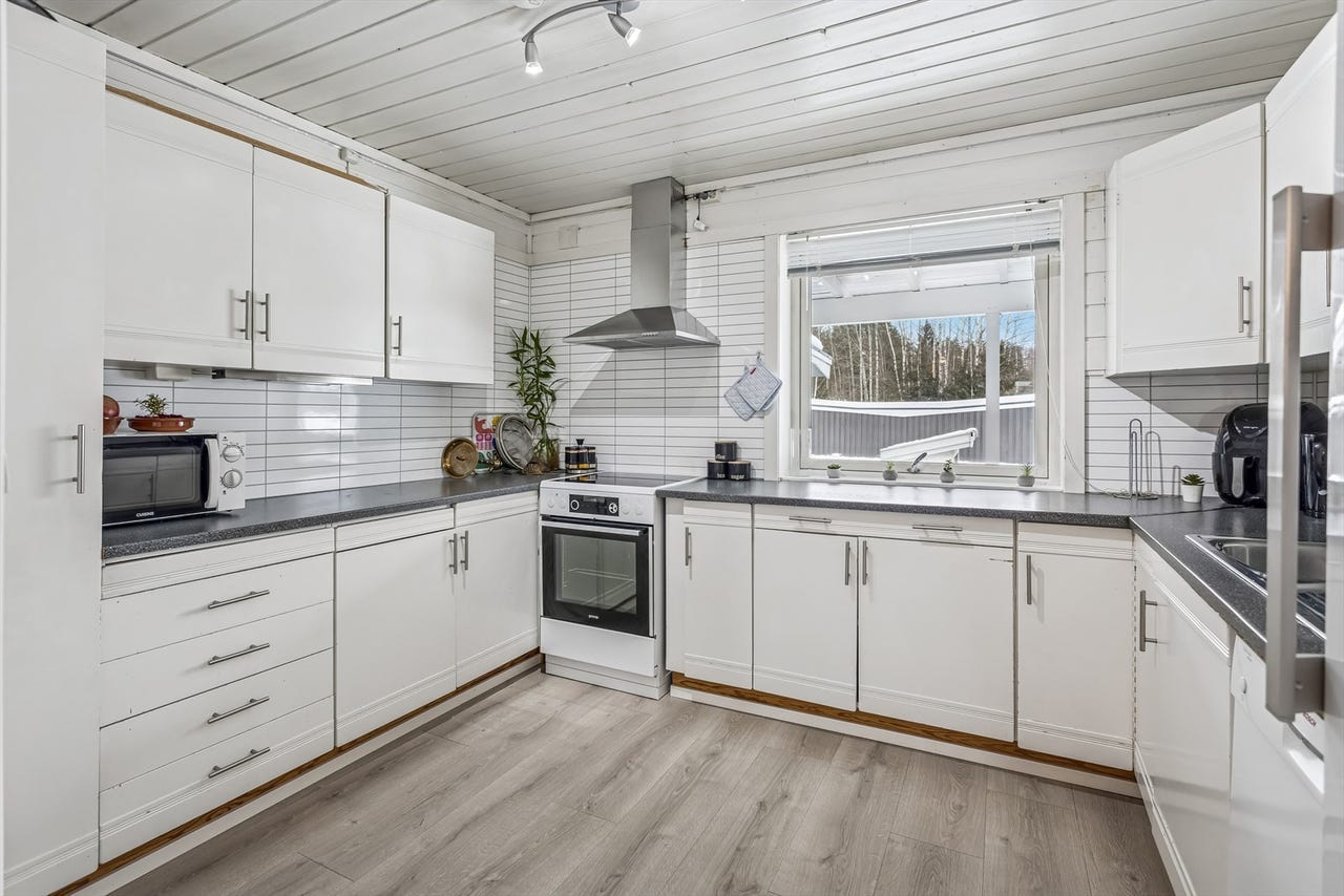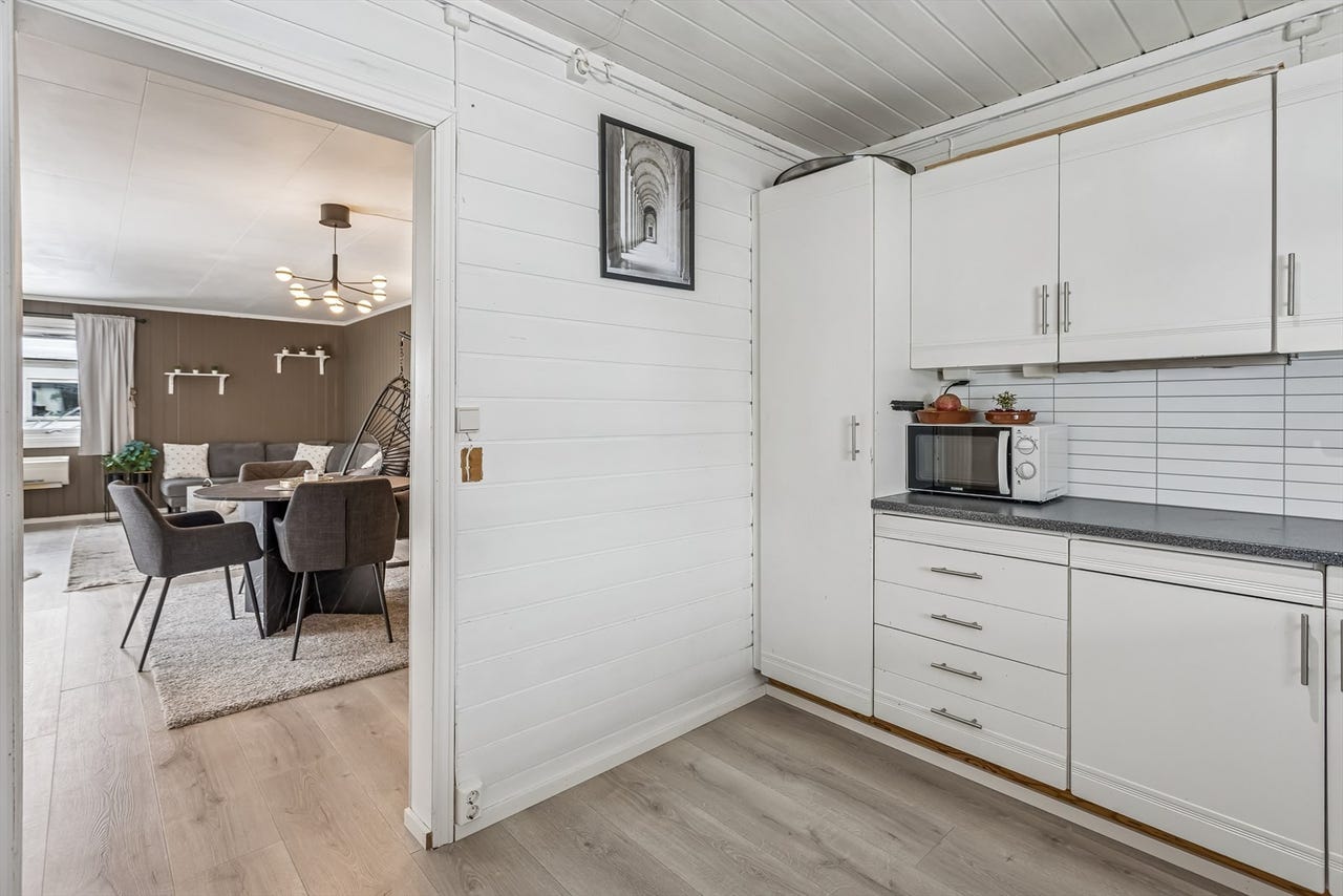 Kjøkkeninnredning av ukjent alder med med malte fronter og laminerte skrog. Laminert benkeplate med nedsenket oppvaskkum i metall. Veggflater over benkeplater med laminerte plater, overgang med mykfug. Kjøkken med opplegg for oppvaskmaskin, hvitevarer er montert i kjøkkennisjer. Lekkasjevakt og komfyrvakt er ikke montert.