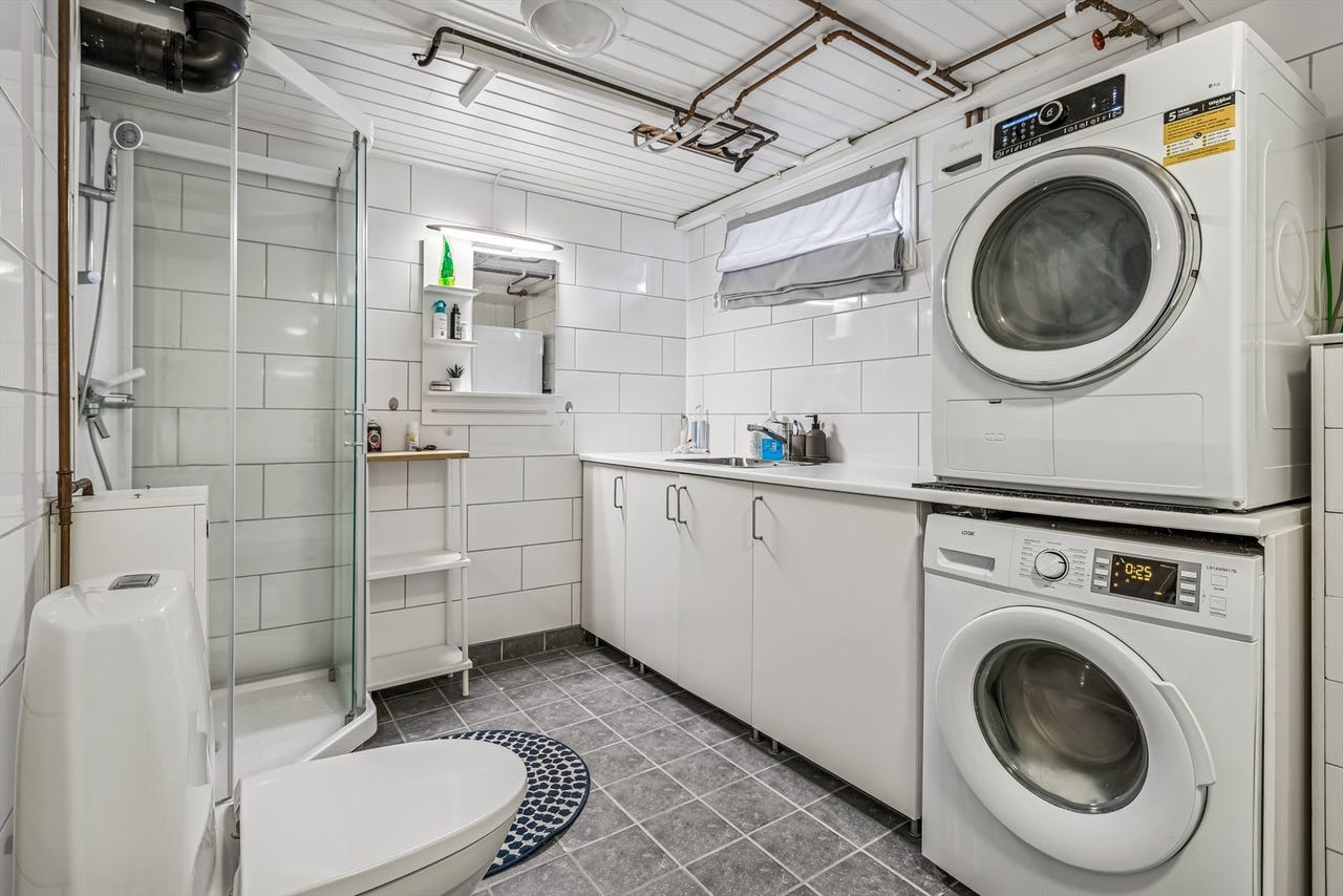 Vaskerom/bad kjeller: Gulv og vegger med fliser. Oppvarming med elektrisk gulvvarme. Installasjoner med gulvmontert WC, utslagskum i innredning, dusjkabinett og opplegg for vaskemaskin.